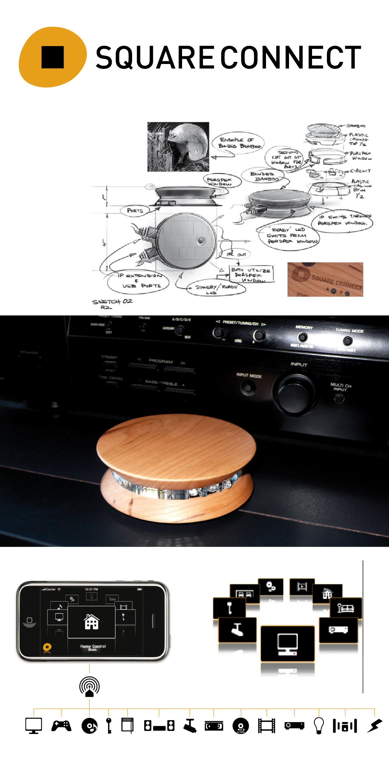 The SQ Blaster together with the SQ Remote application turns your iPhone, computer and even your digital photo frame into the ultimate remote control. Craftsman made from eco-friendly cherry or bamboo, this stylish unit controls all your home entertainment equipment from TV to DVD to ceiling fans. Corporate design, product design and UI design.