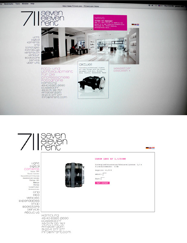 711rent is a photography equipment rental company in Hamburg, Berlin, Amsterdam, Paris, Barcelona, Ibiza, Frankfurt, and Duesseldorf. Corporate design including logo, print advertising and website. Since 2007