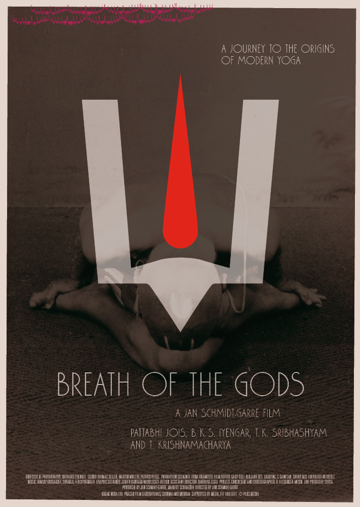 Design of the posters, dvd case, and website for the film Der atmende Gott / Breath of the Gods by director Jan Schmidt-Garre. The movie is a documentary about the roots of modern yoga.