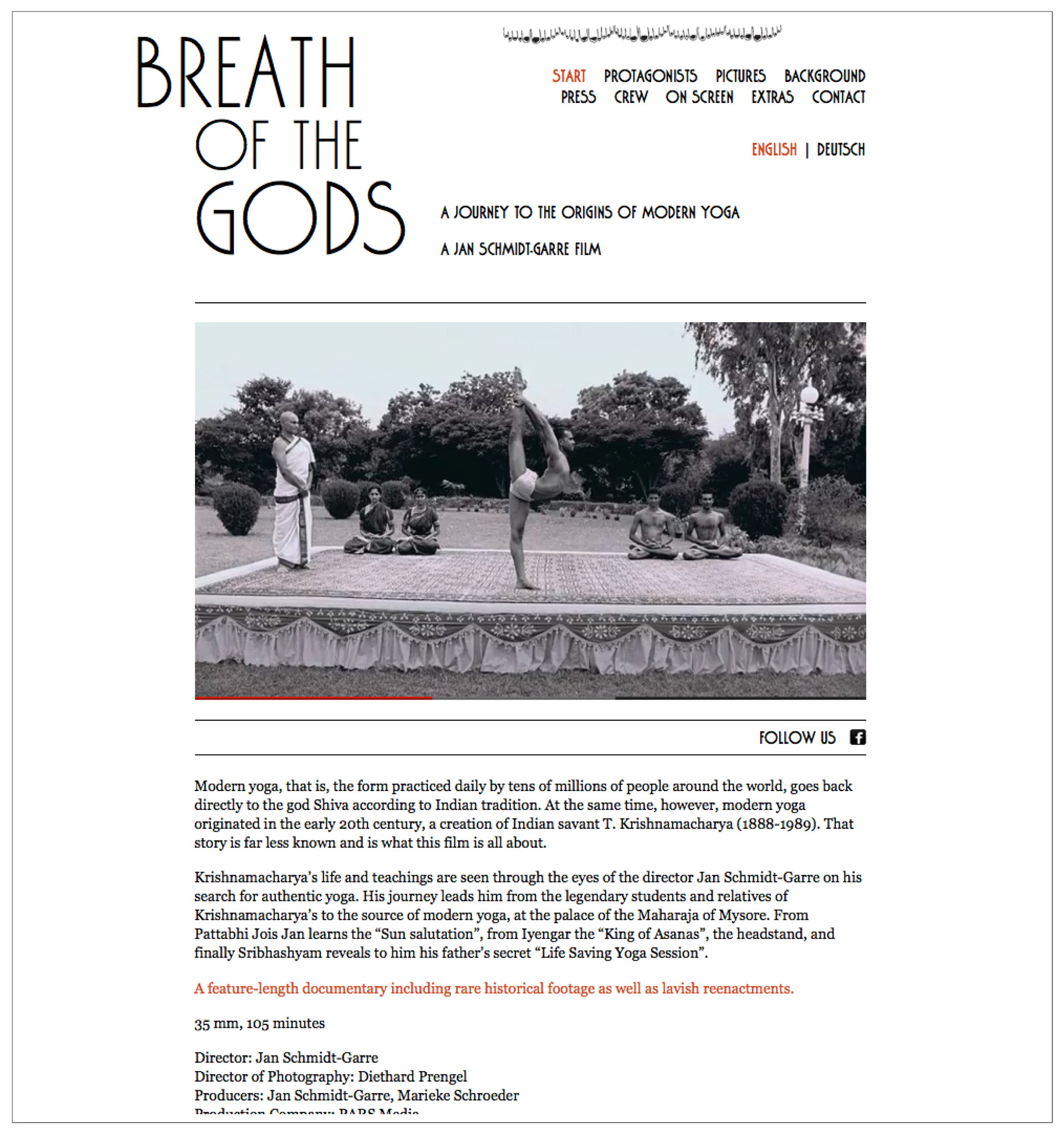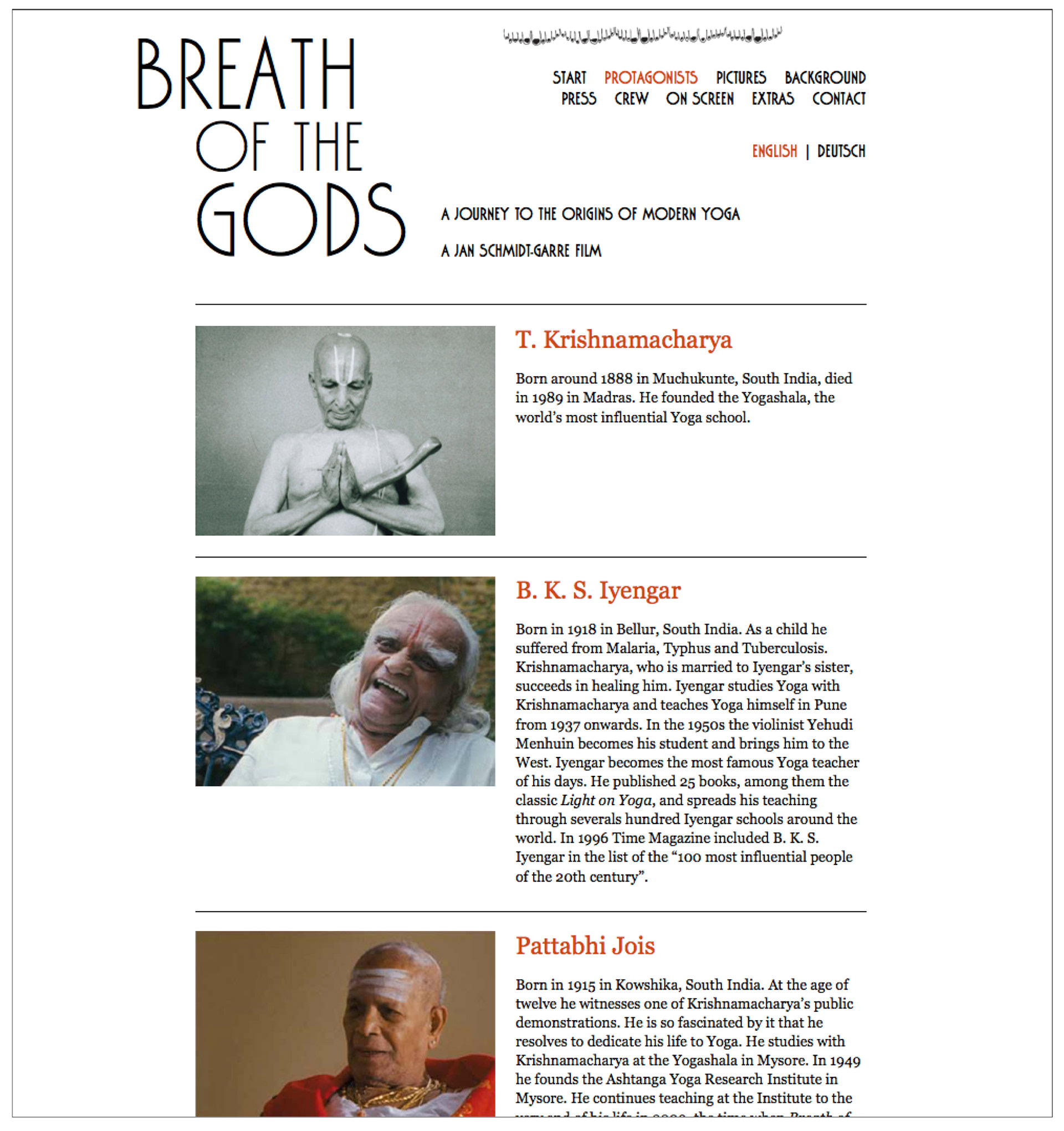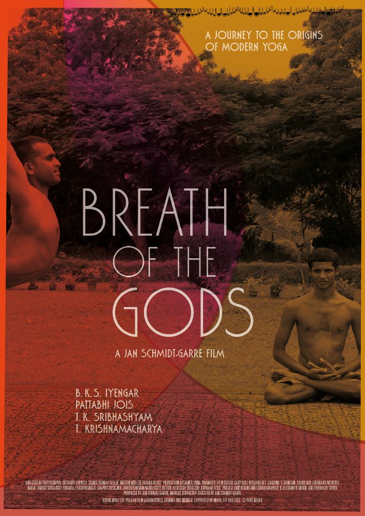 Design of the posters, dvd case, and website for the film Der atmende Gott / Breath of the Gods by director Jan Schmidt-Garre. The movie is a documentary about the roots of modern yoga.