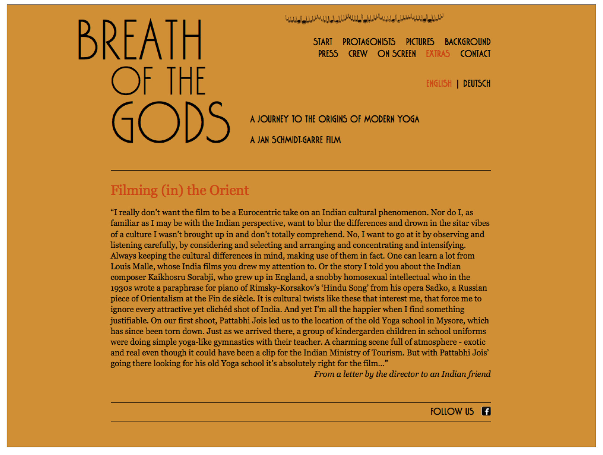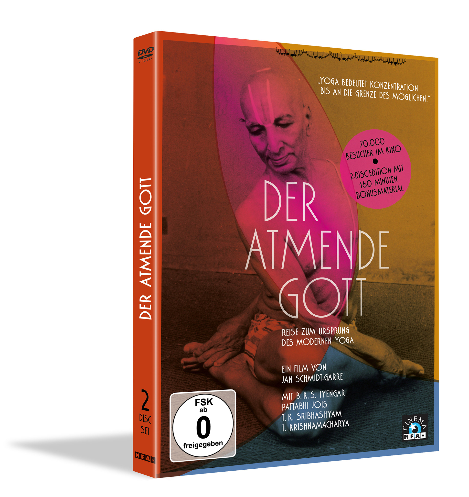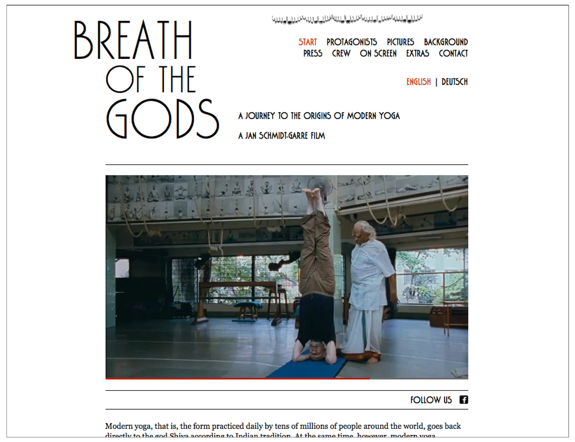 Design of the posters, dvd case, and website for the film Der atmende Gott / Breath of the Gods by director Jan Schmidt-Garre. The movie is a documentary about the roots of modern yoga.