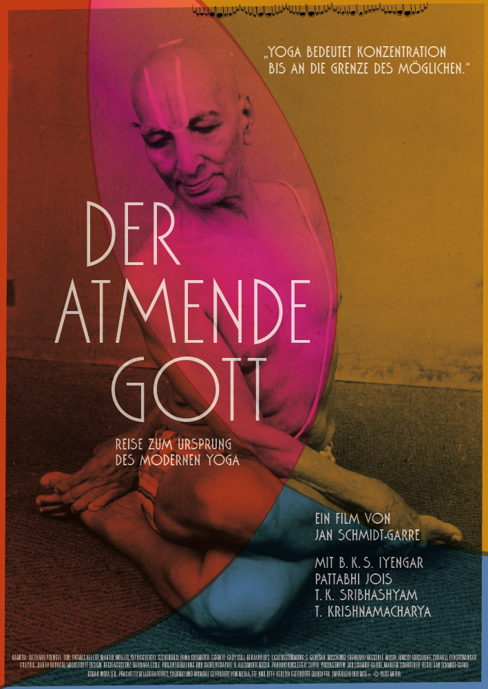 Design of the website, posters, and dvd case for the film Der atmende Gott / Breath of the Gods by director Jan Schmidt-Garre. The movie is a documentary about the roots of modern yoga.