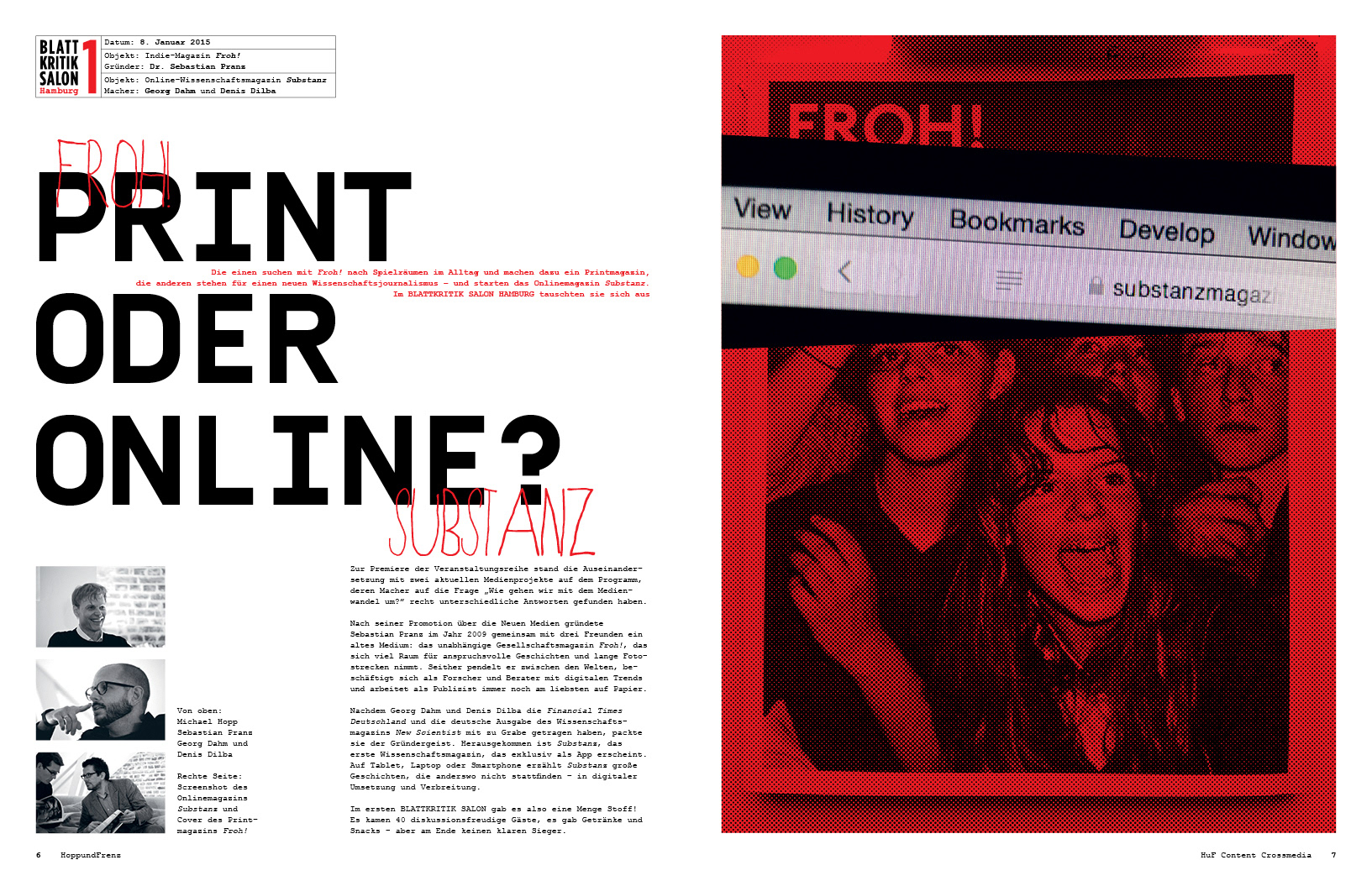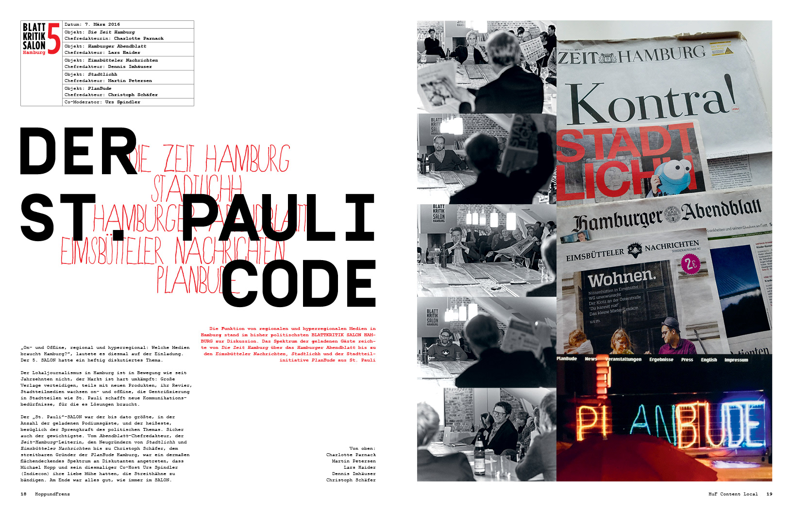 Image brochure in newspaper format for the German media/news company HoppundFrenz highlighting their project "Blattkritik Salon Hamburg".