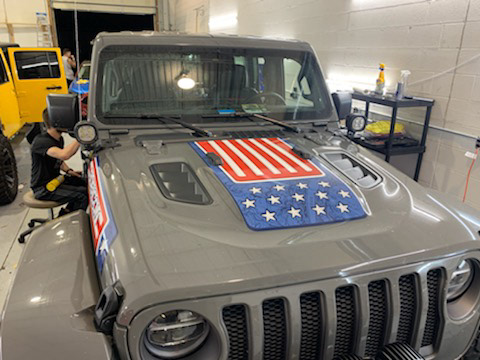 A wrap design for Jeep with the brief being to use the American flag. This design features a topographical map of Moab Utah.
