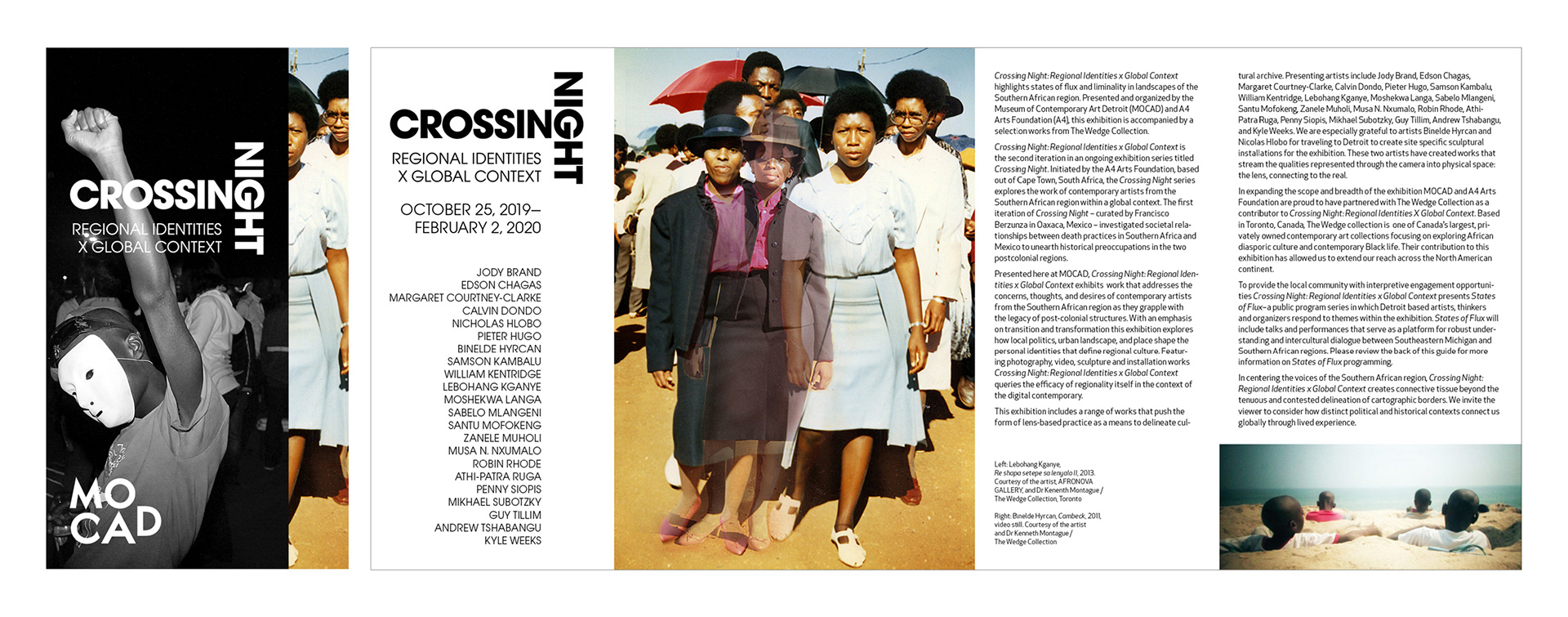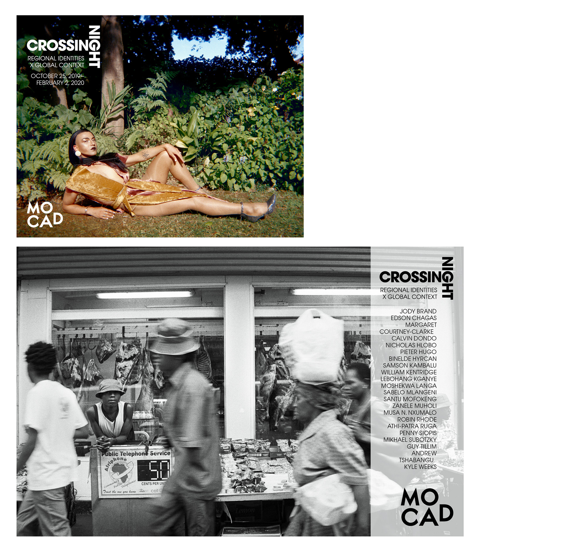 Design of exhibition identity, catalog, and promotional material for Crossing Night: Regional Identities x Global Context at MOCAD
