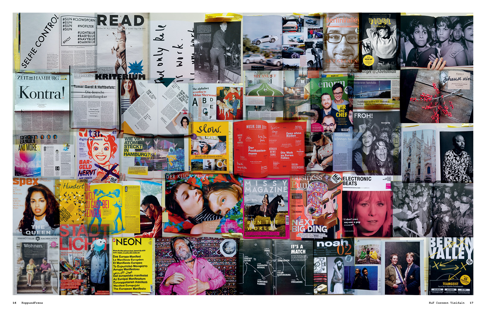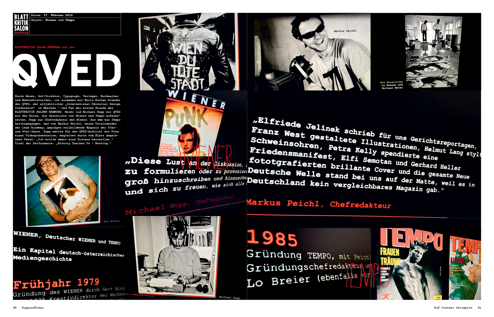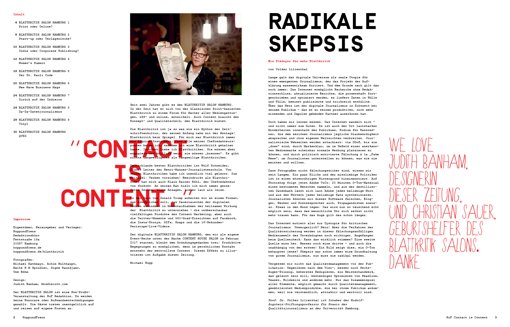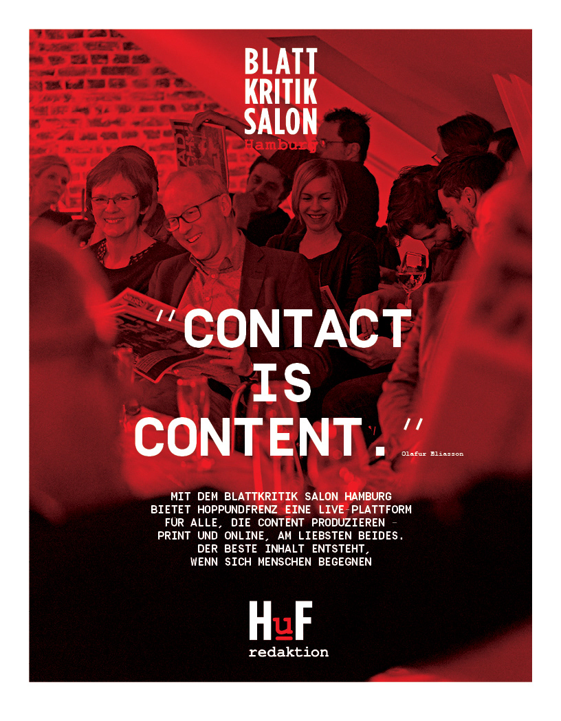 Image brochure in newspaper format for the German media/news company HoppundFrenz highlighting their project "Blattkritik Salon Hamburg".